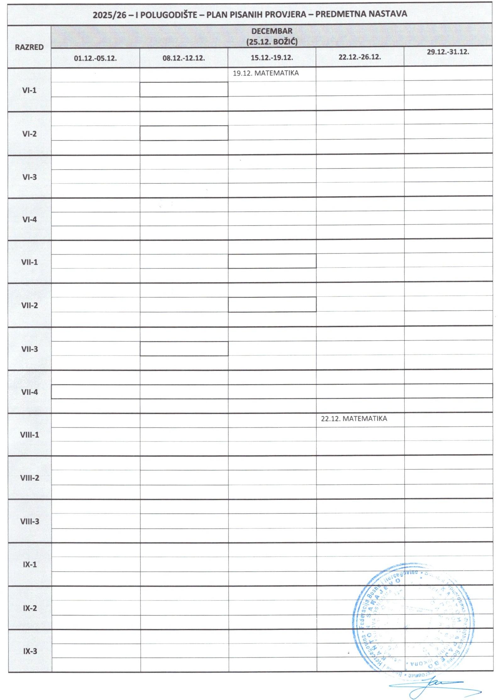 PLAN PISANIH PROVJERA - PREDMETNA NASTAVA - 2025/2026 - I POLUGODIŠTE