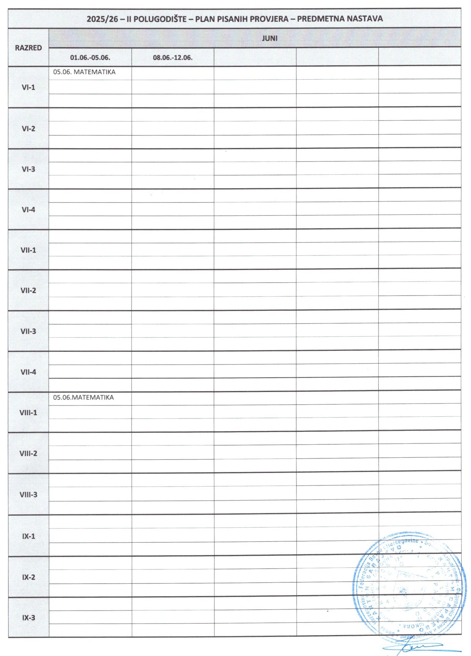 DOPUNA PLANA PISANIH PROVJERA - PREDMETNA NASTAVA - 2025/2026 - II POLUGODIŠTE