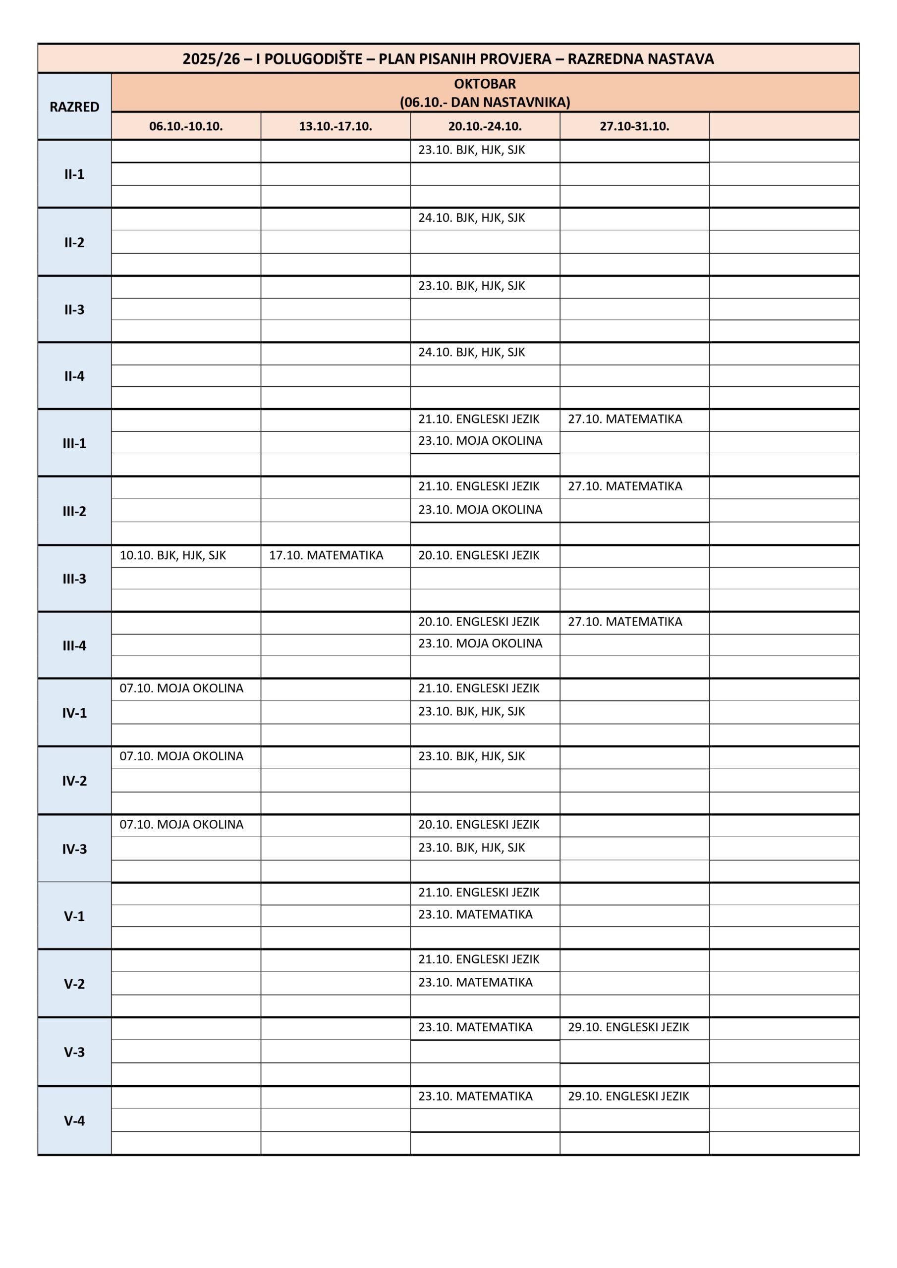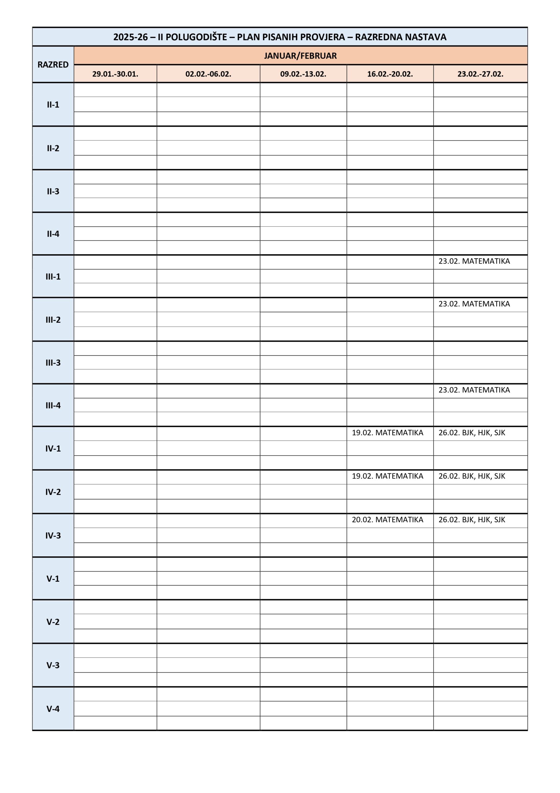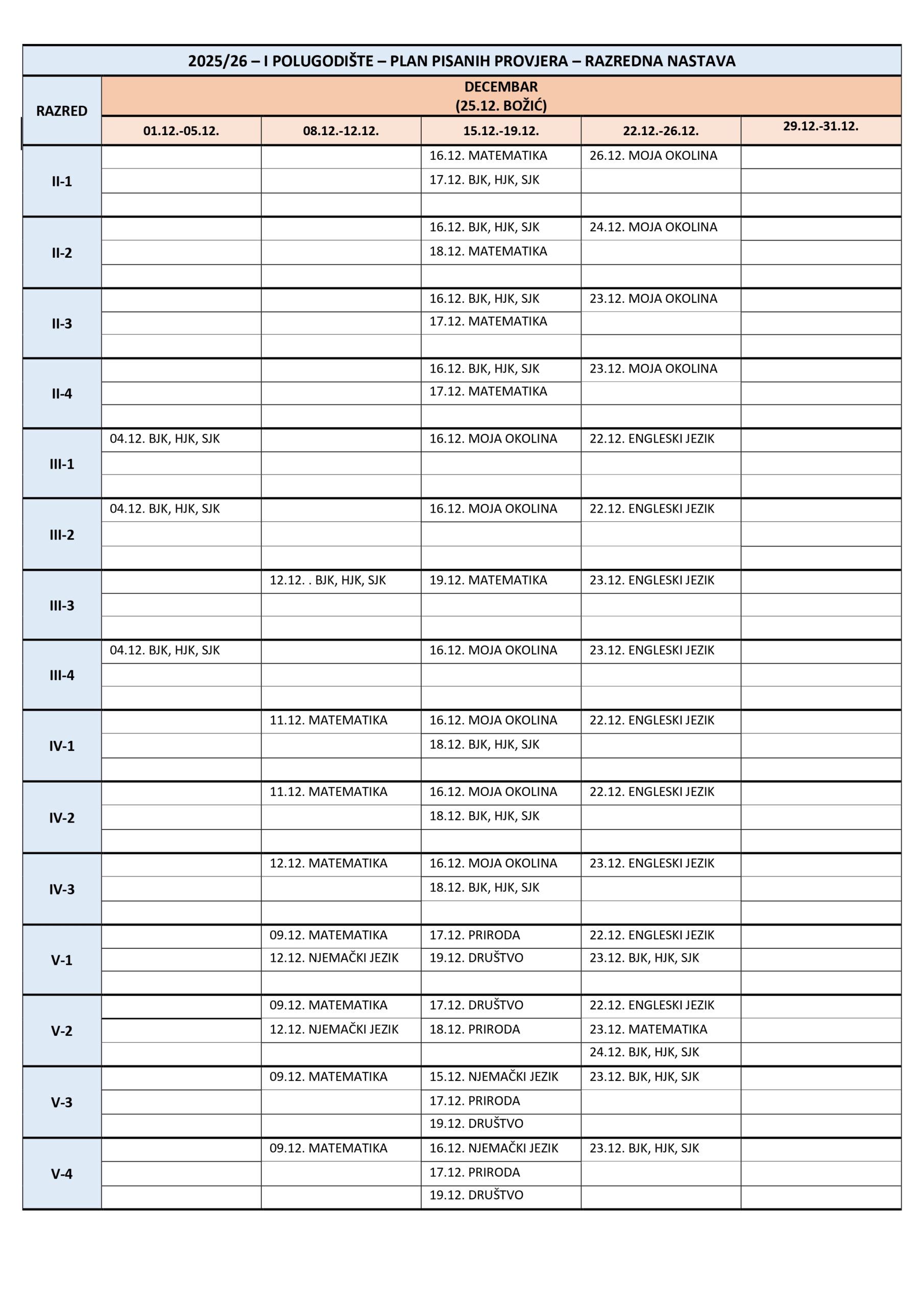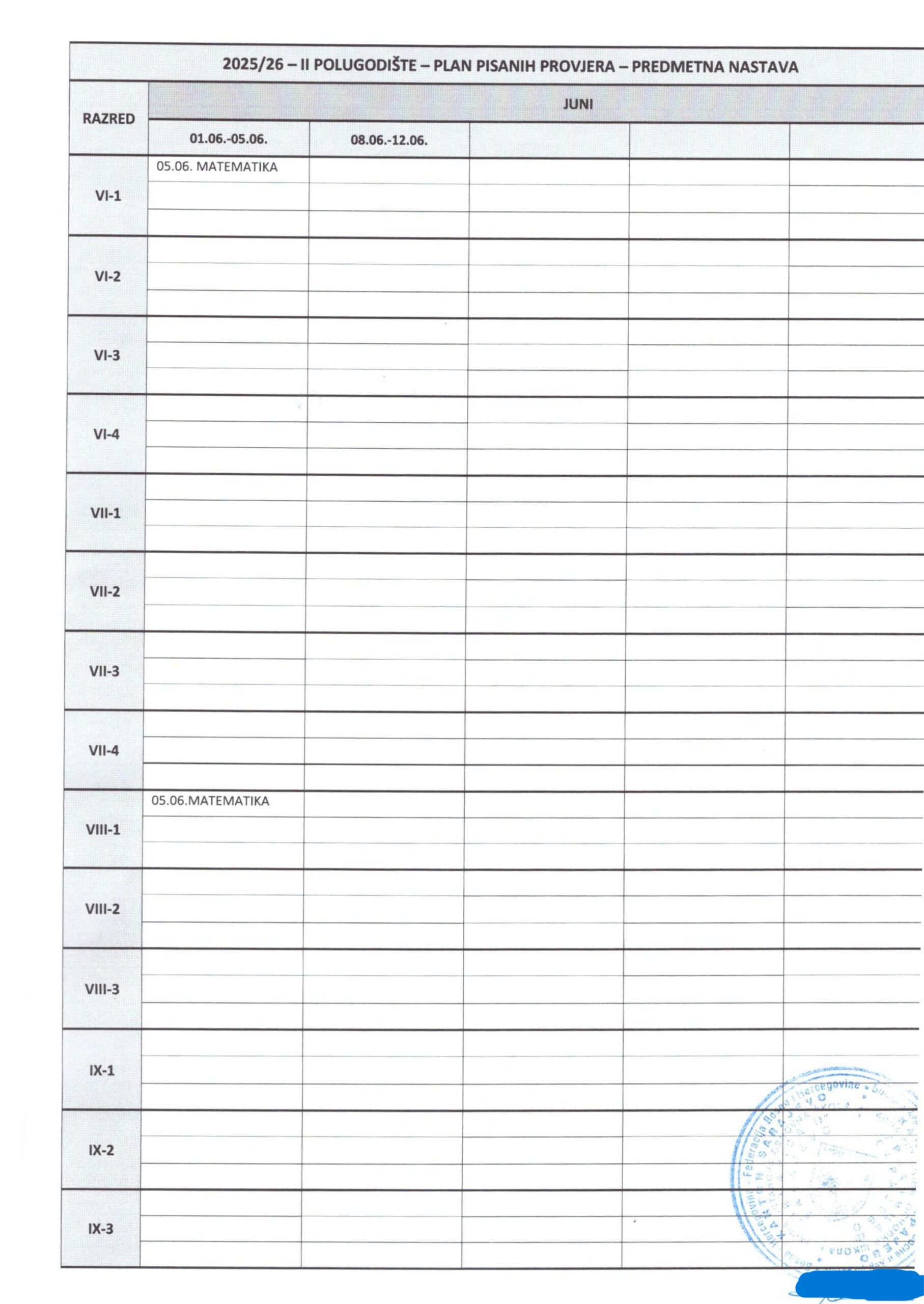 Plan pisanih provjera Razredna nastava I polugodište, školska 2025/2026. godina. Plan pisanih provjera Predmetna nastava I polugodište, školska 2025/2026. godina. Plan pisanih provjera Razredna nastava II polugodište, školska 2025/2026. godina. Plan pisanih provjera Predmetna nastava II polugodište, školska 2025/2026. godina. Podune pismenih provjera Hemija Matematika