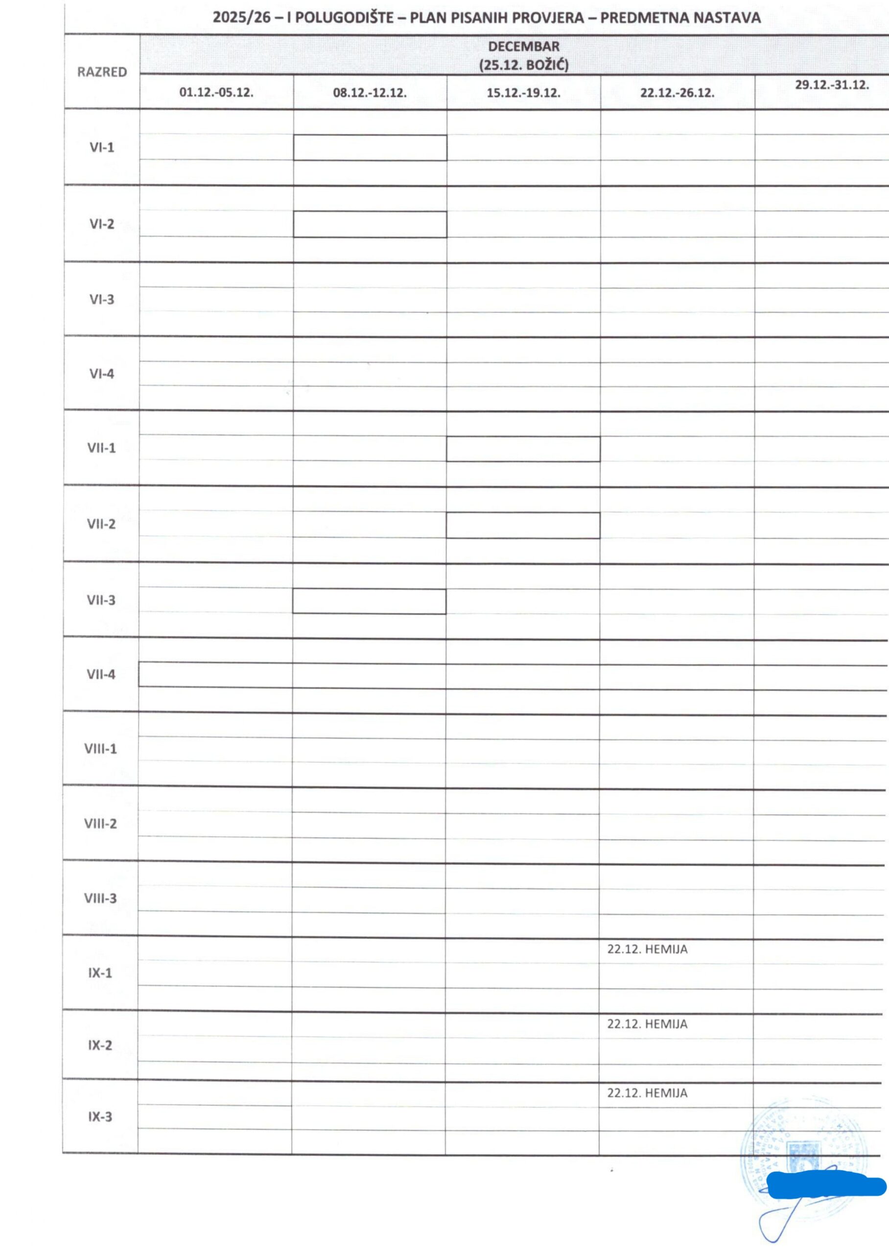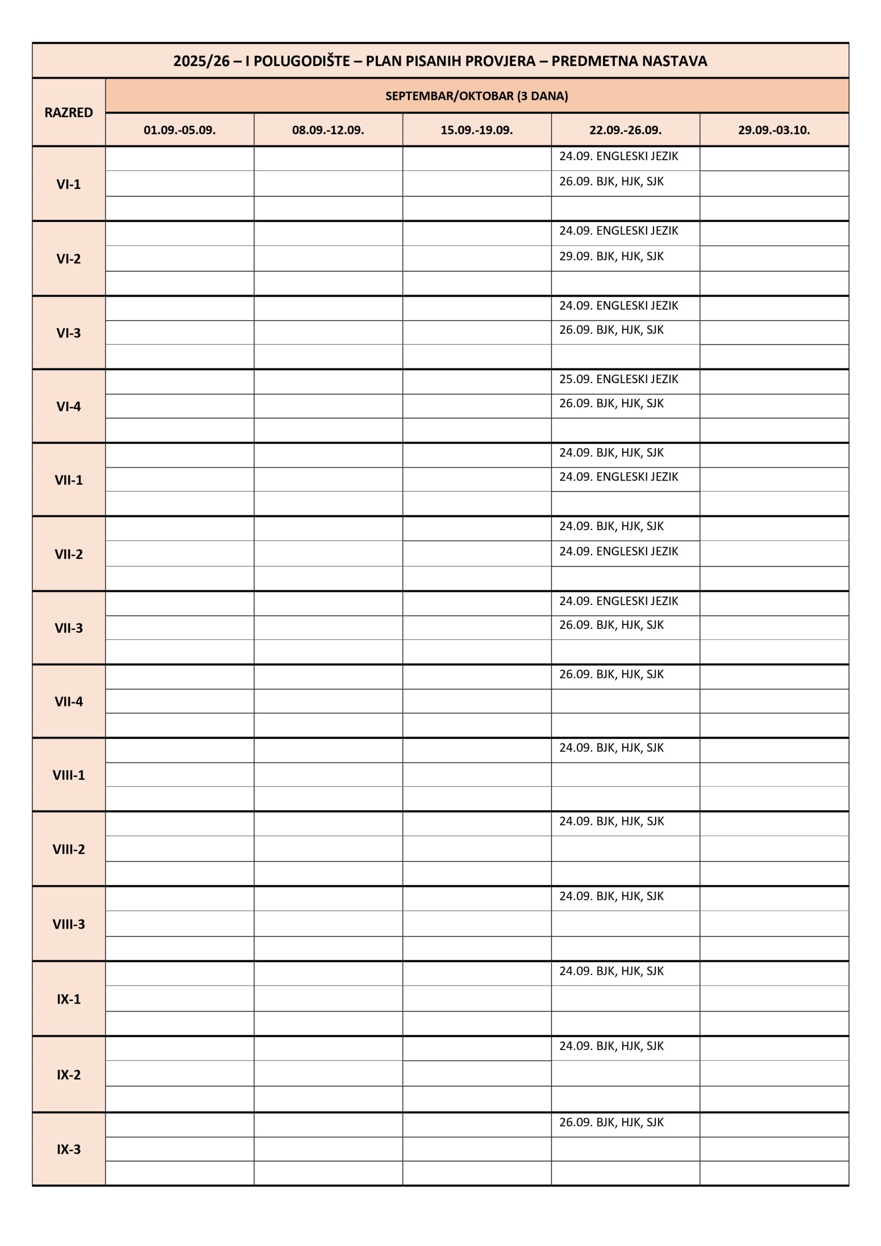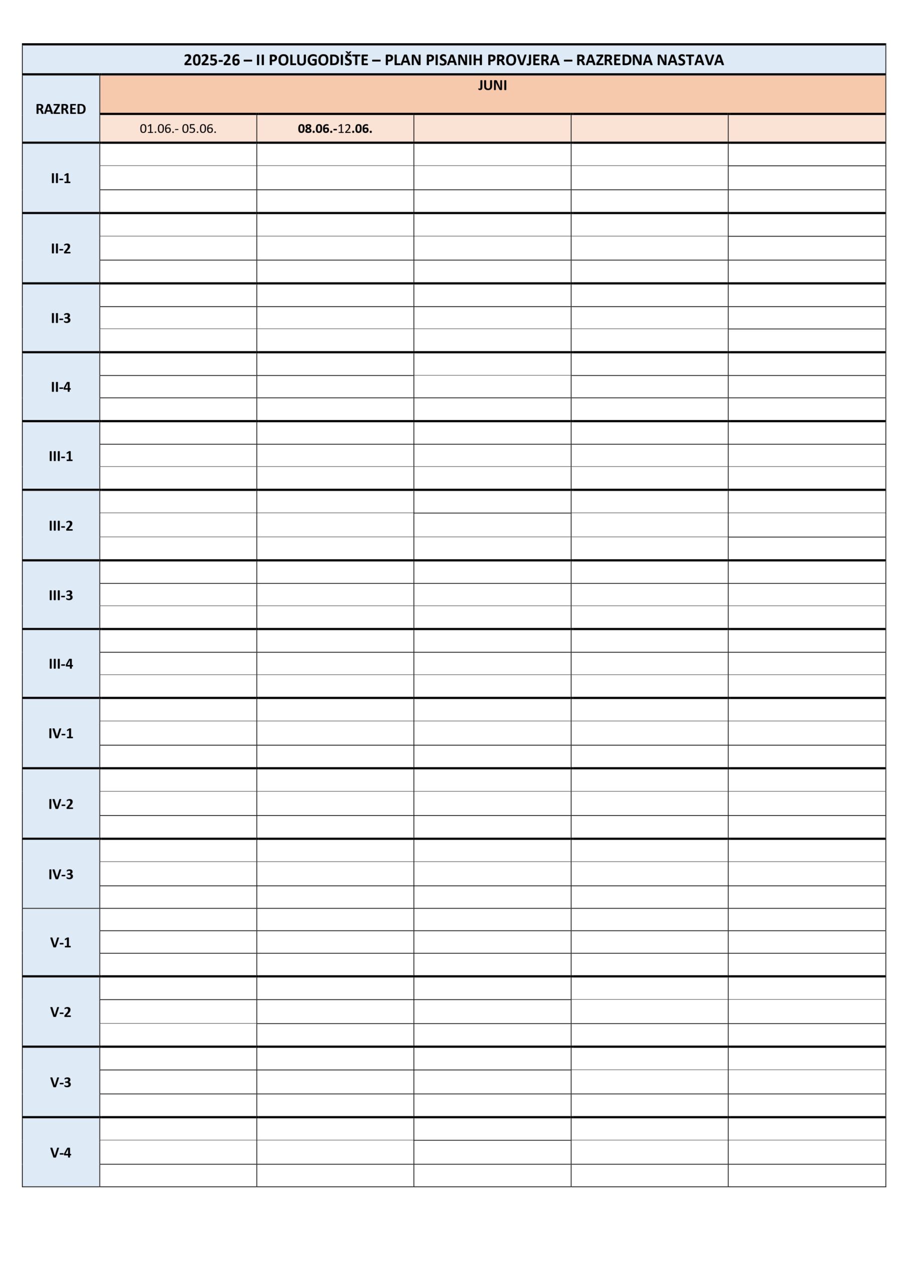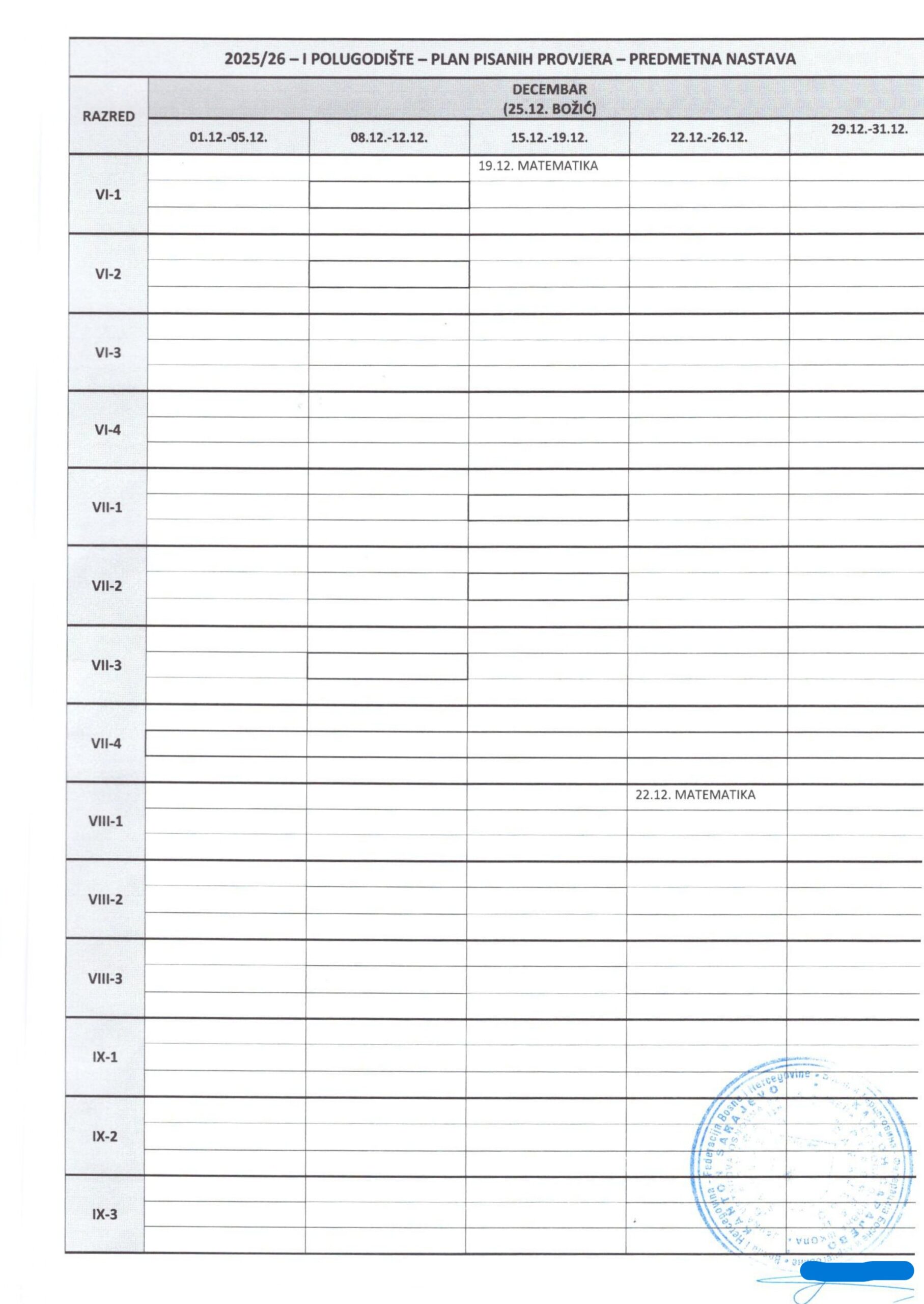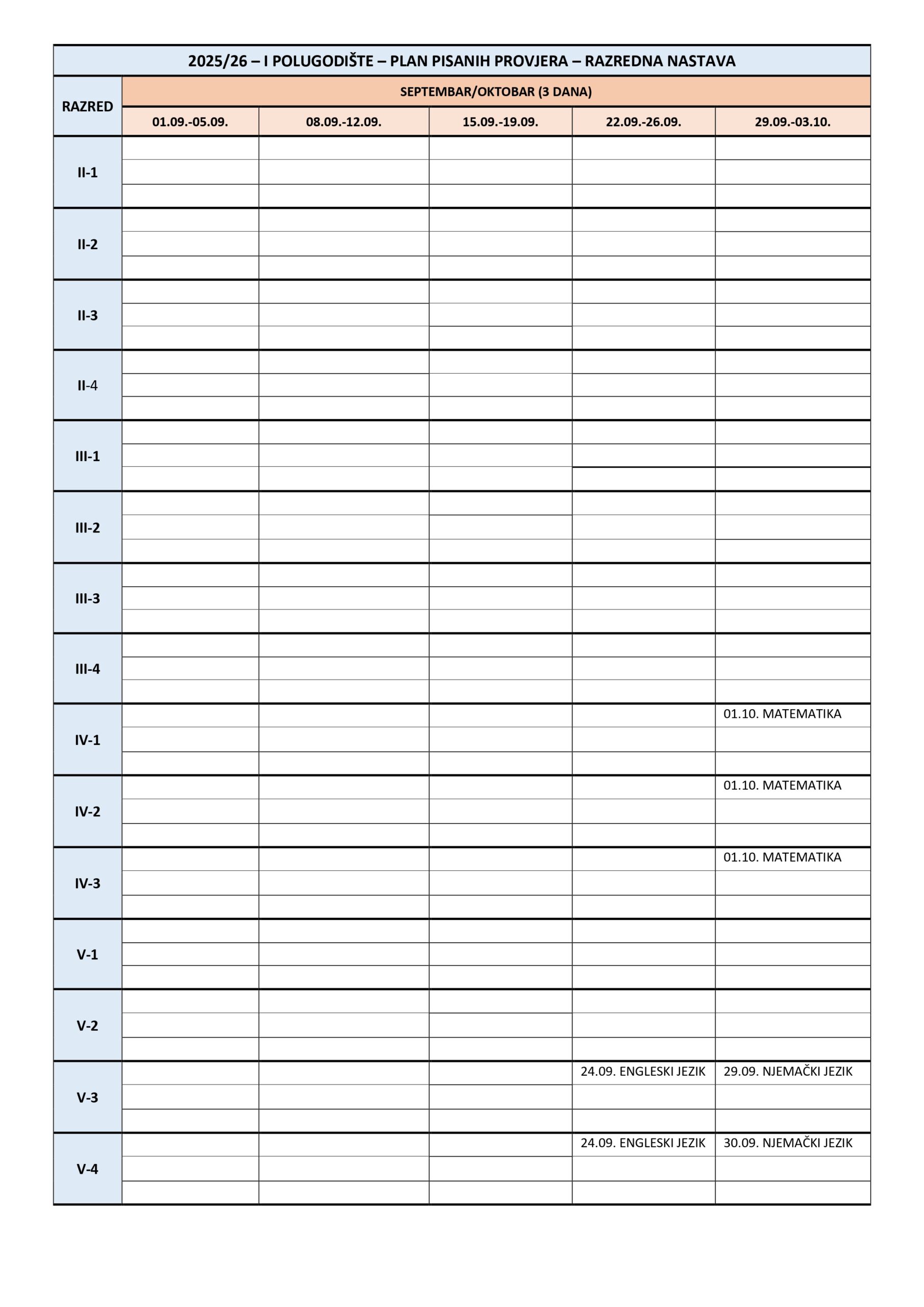 Plan pisanih provjera Razredna nastava I polugodište, školska 2025/2026. godina. Plan pisanih provjera Predmetna nastava I polugodište, školska 2025/2026. godina. Plan pisanih provjera Razredna nastava II polugodište, školska 2025/2026. godina. Plan pisanih provjera Predmetna nastava II polugodište, školska 2025/2026. godina. Podune pismenih provjera Hemija Matematika