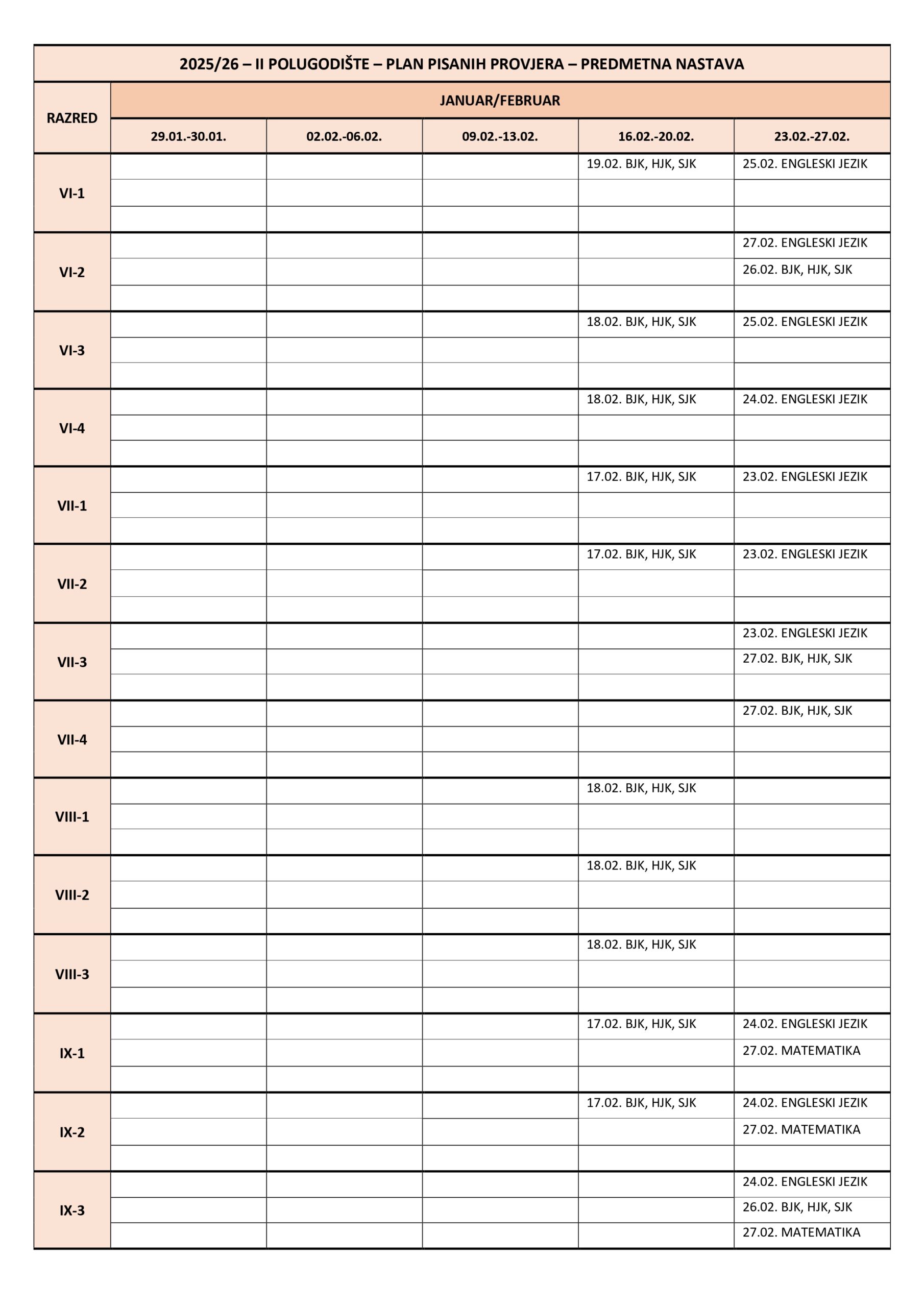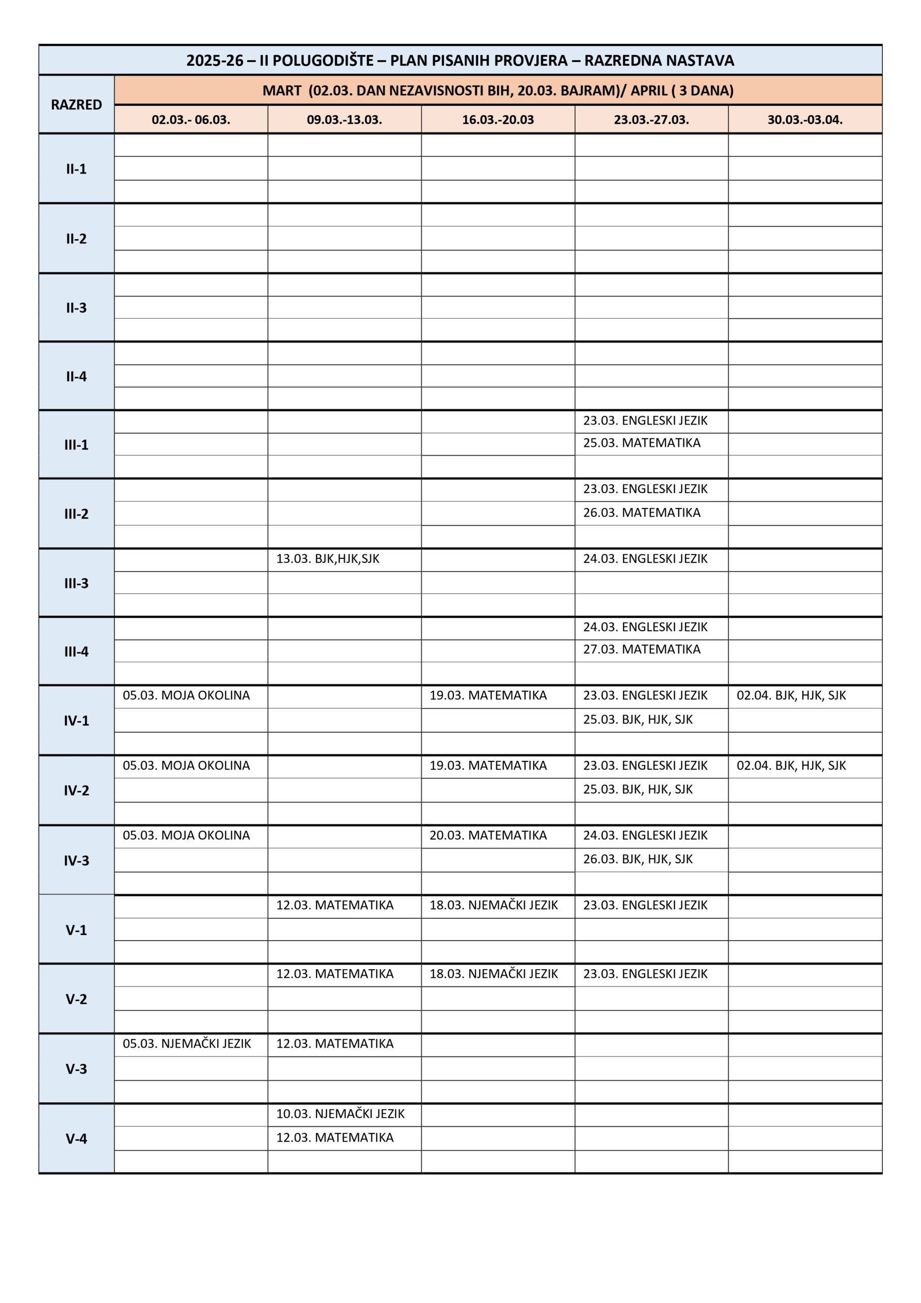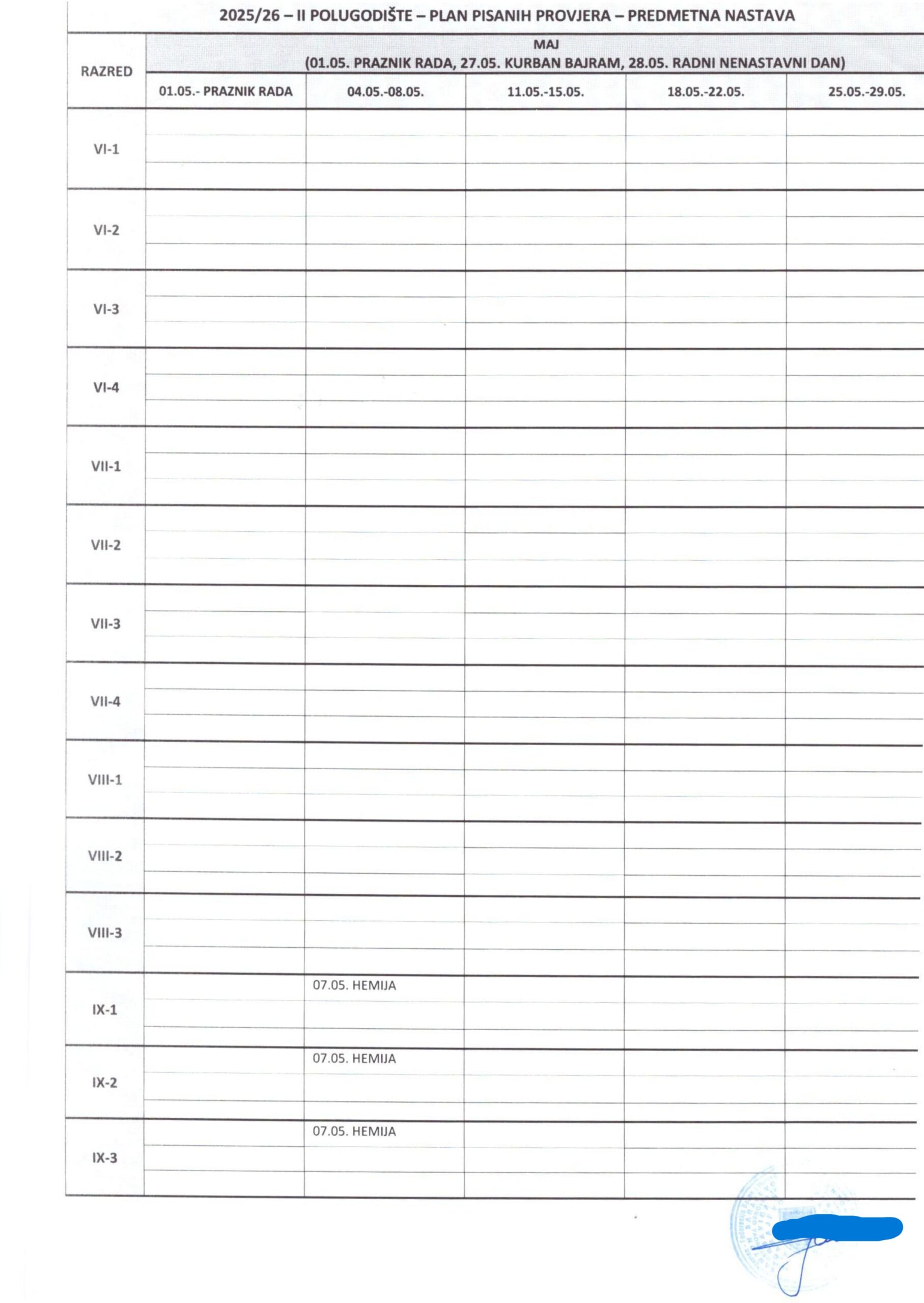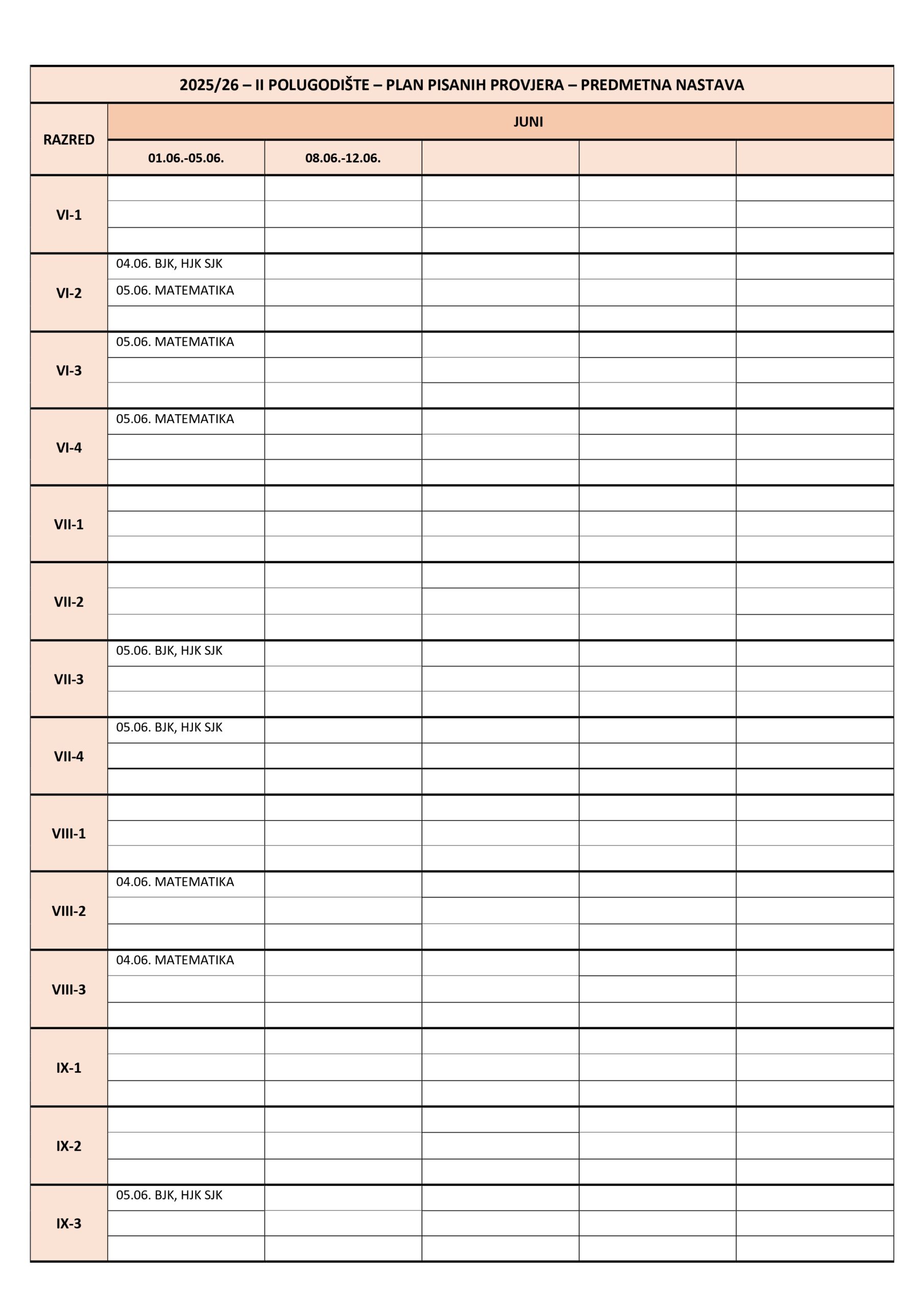 Plan pisanih provjera Razredna nastava I polugodište, školska 2025/2026. godina. Plan pisanih provjera Predmetna nastava I polugodište, školska 2025/2026. godina. Plan pisanih provjera Razredna nastava II polugodište, školska 2025/2026. godina. Plan pisanih provjera Predmetna nastava II polugodište, školska 2025/2026. godina. Podune pismenih provjera Hemija Matematika