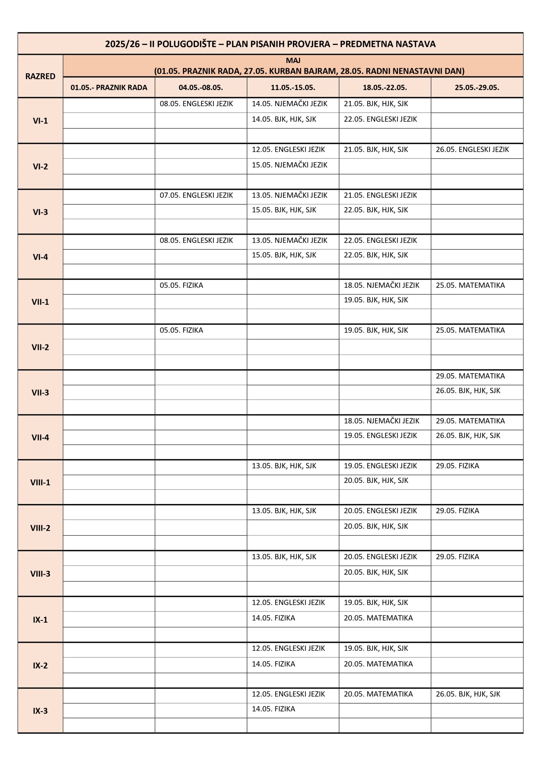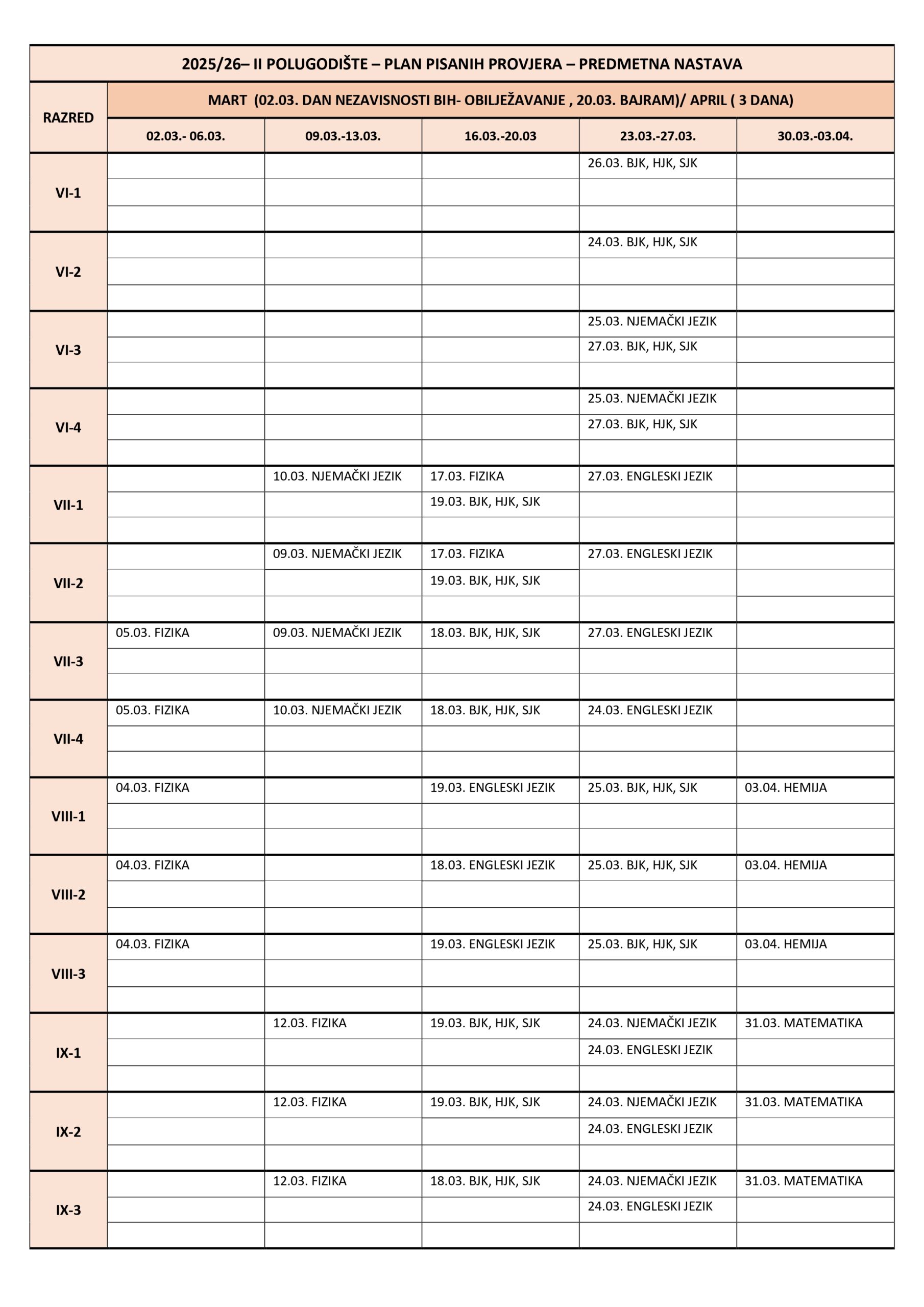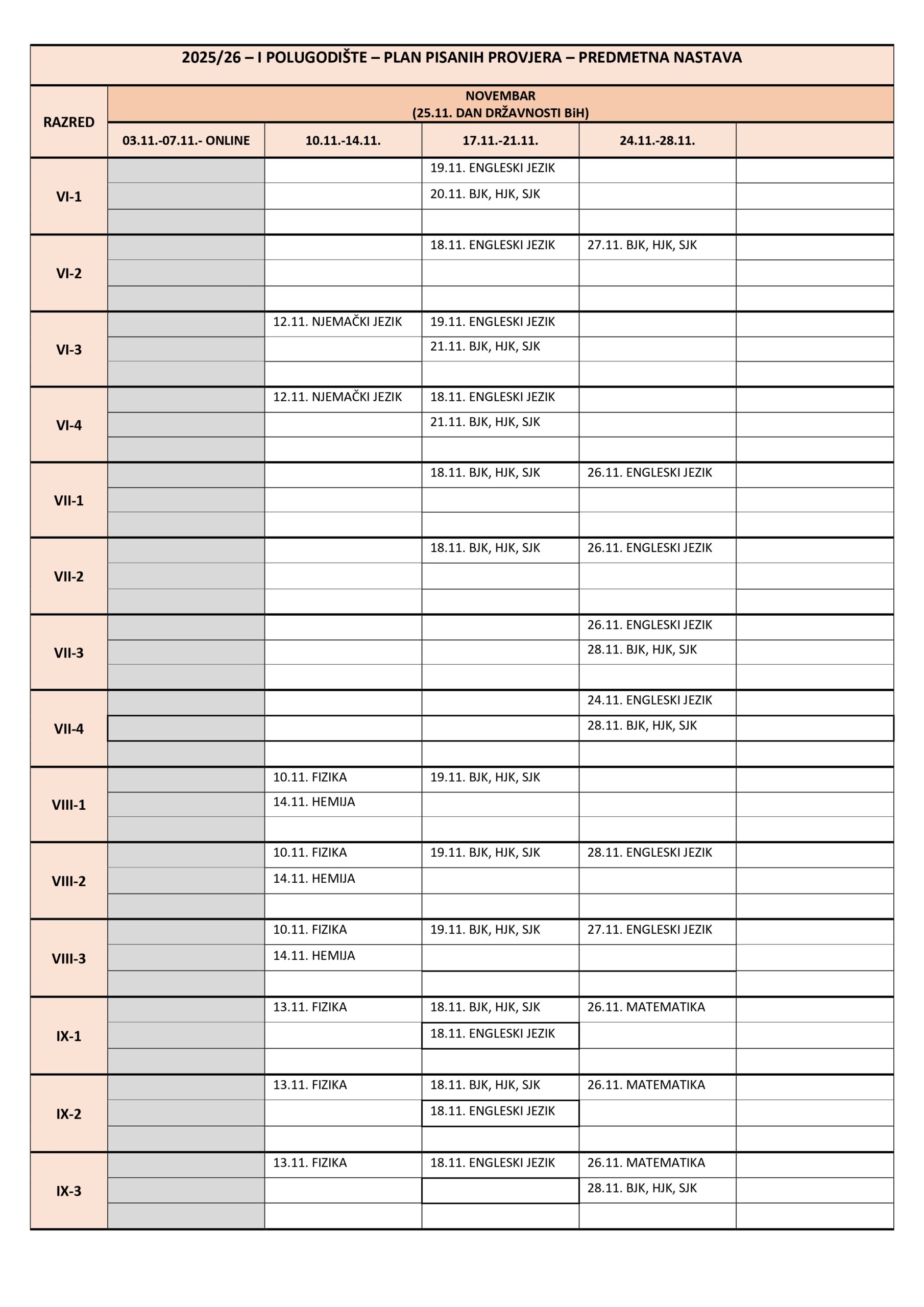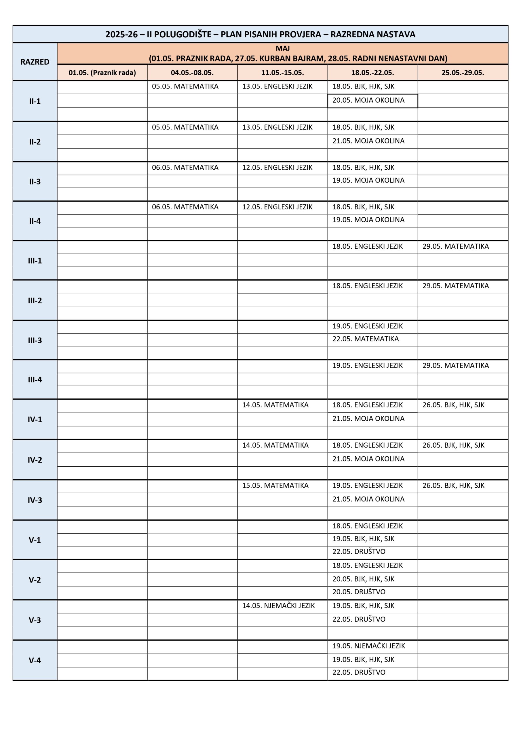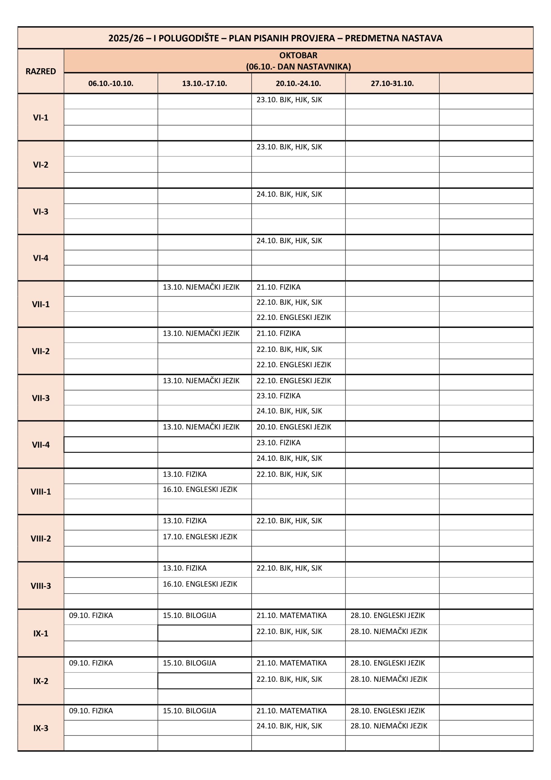 Plan pisanih provjera Razredna nastava I polugodište, školska 2025/2026. godina. Plan pisanih provjera Predmetna nastava I polugodište, školska 2025/2026. godina. Plan pisanih provjera Razredna nastava II polugodište, školska 2025/2026. godina. Plan pisanih provjera Predmetna nastava II polugodište, školska 2025/2026. godina. Podune pismenih provjera Hemija Matematika